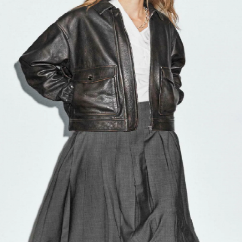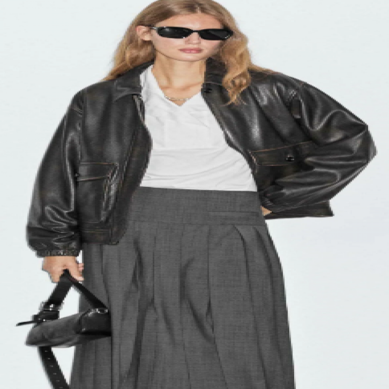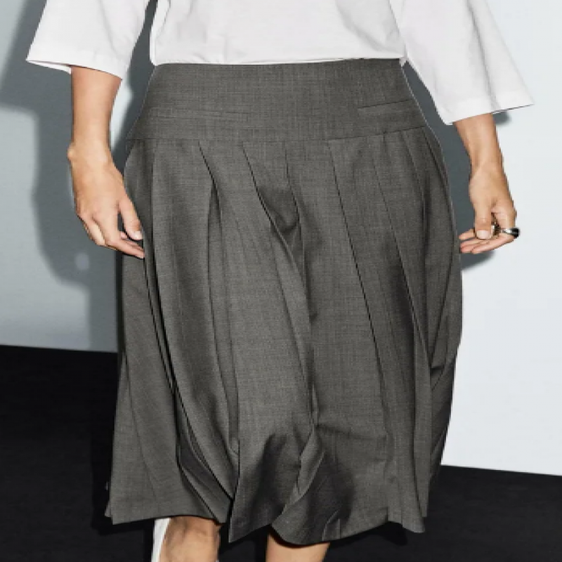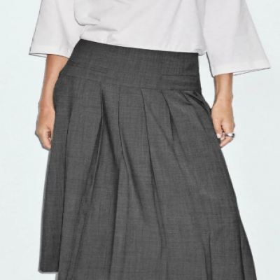 Saia midi com pregas. Fecho lateral por zíper. Dois bolsos embutidos.