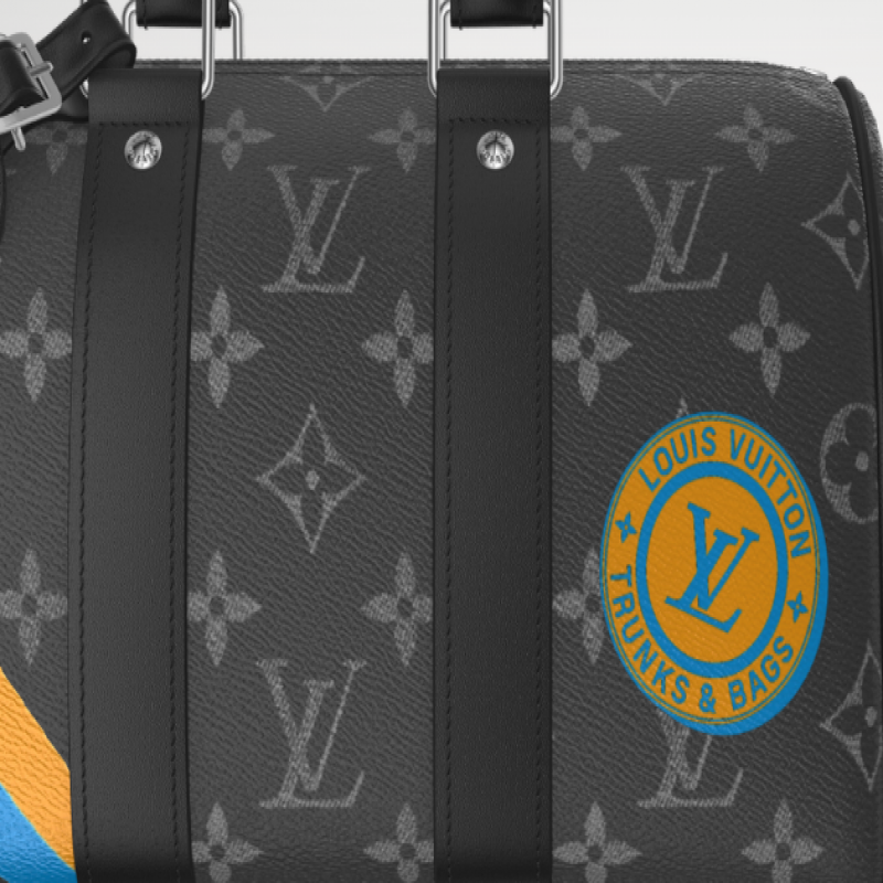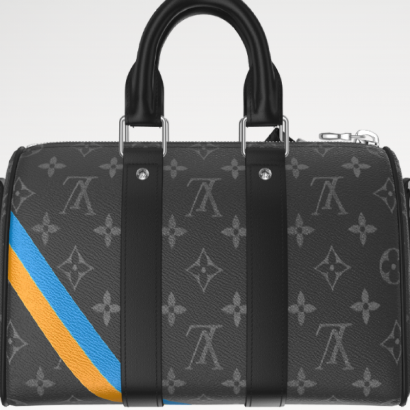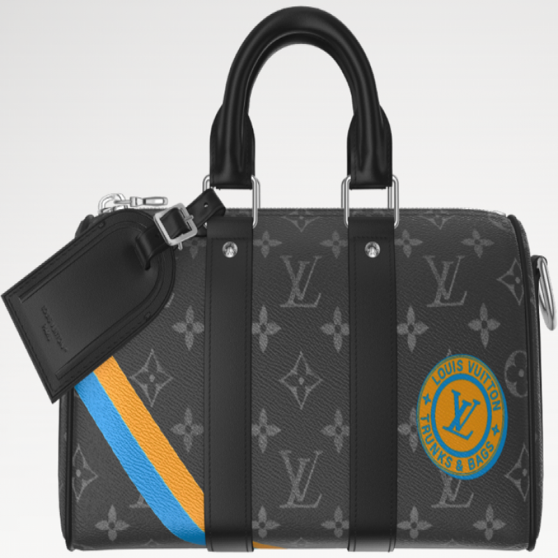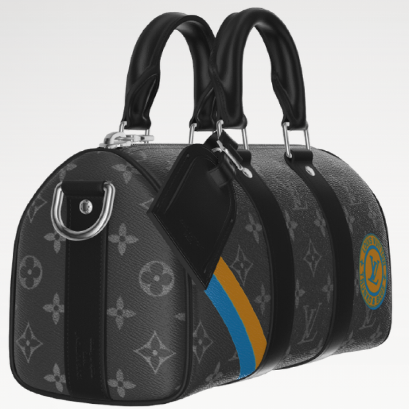A bolsa compacta Keepall 25 em canvas Monogram Eclipse faz parte da linha Mon Monogram e pode ser personalizada. Estampas, incluindo listras, iniciais e patches, tornam cada bolsa única. A estilosa Keepall possui duas faixas laterais de couro e uma etiqueta de identificação em couro. Uma alça removível e ajustável oferece opções de transporte.