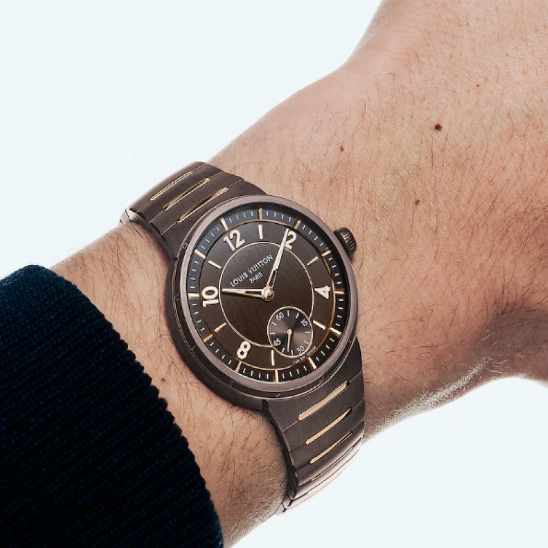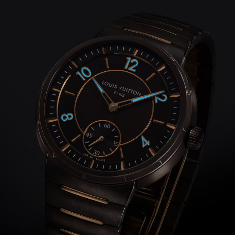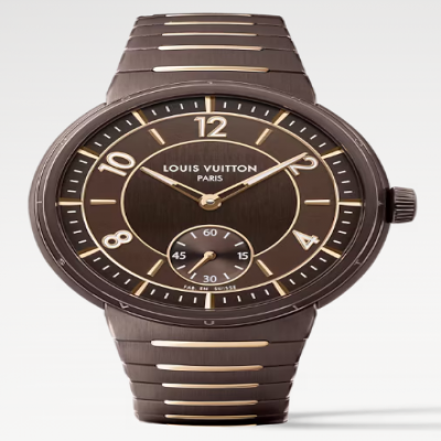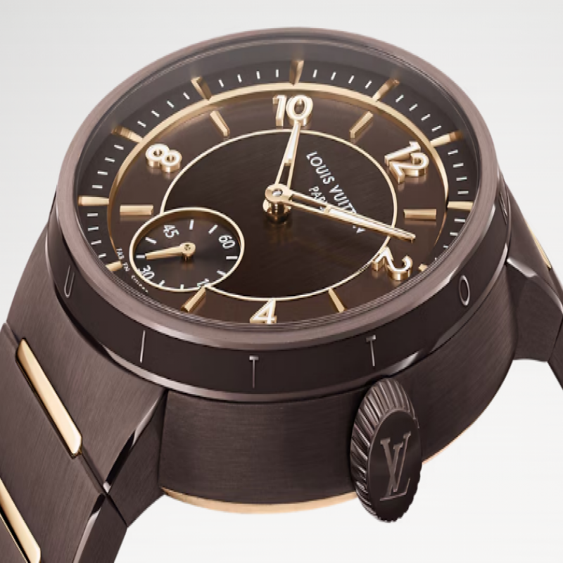 Uma reinterpretação moderna e esportiva de um clássico atemporal, o Tambour Automático de 40 mm combina cerâmica com acabamento fosco contemporâneo e ouro rosa quente pela primeira vez na história da relojoaria da Louis Vuitton. O relógio exemplifica o artesanato de alta qualidade, com cada componente meticulosamente trabalhado e finalizado manualmente para alcançar uma estética impecável. A pulseira é feita sem pinos visíveis, o que mantém o visual elegante e elegante.